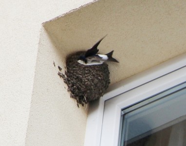 A tatai városháza egyik udvarra néző ablakában rakott fészket egy molnárfecske-család. A kedves kis védett madár legfőbb ismertetőjegye a sötét hát, s rajta egy élesen elütő fehér csík. Feje kékesfekete, szárnya fekete, farka enyhén villás. A testhossza 13-15 centiméter.