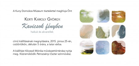 A Kuny Domokos Múzeum tisztelettel meghívja Önt Kerti Károly György Kavicsok fényben haikuk és akvarellek című kiállításának megnyitására, 2015. június 25-én, csütörtökön, délután 5 órára, a tatai várba. A kiállítást Kövesdi Mónika művészettörténész nyitja meg. Közreműködik Petrozsényi Eszter színművész. Mindenkit szeretettel várunk!