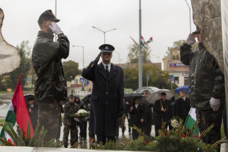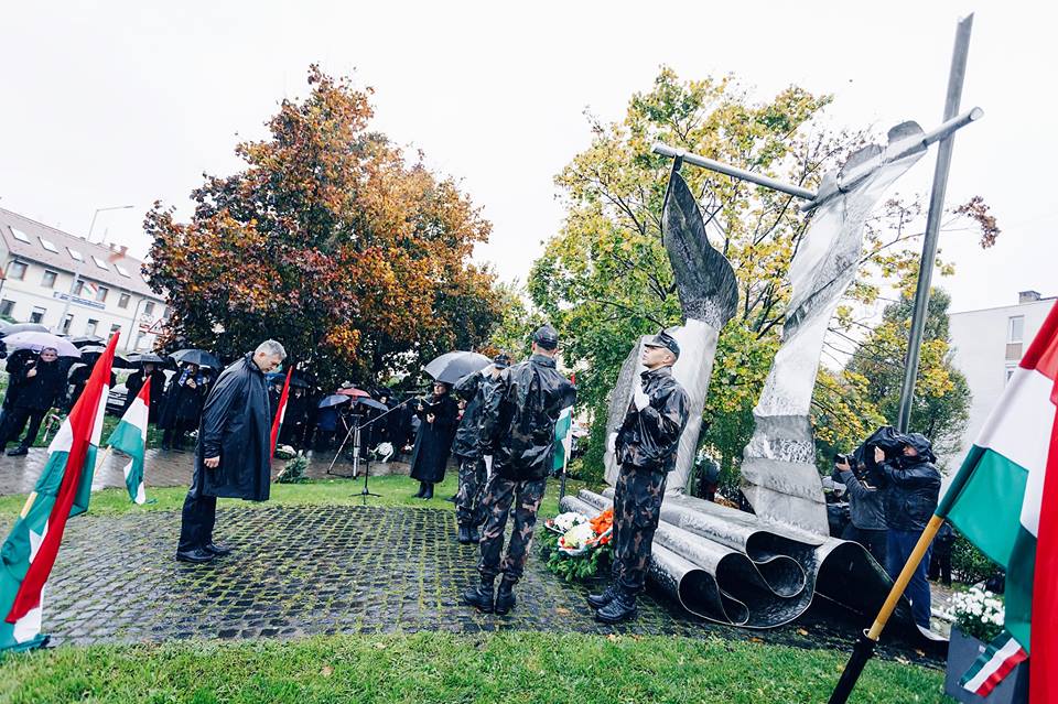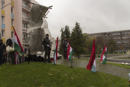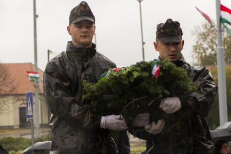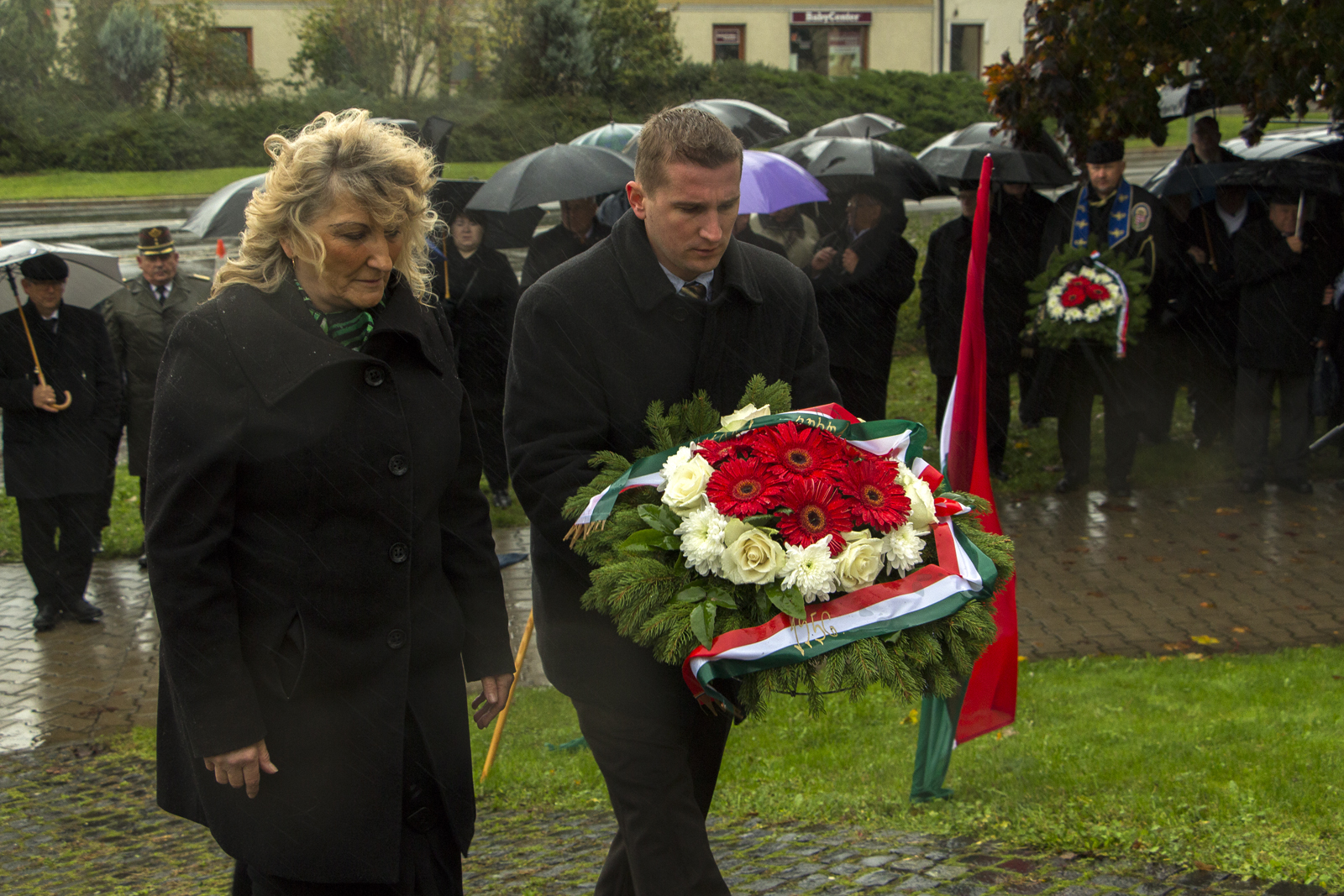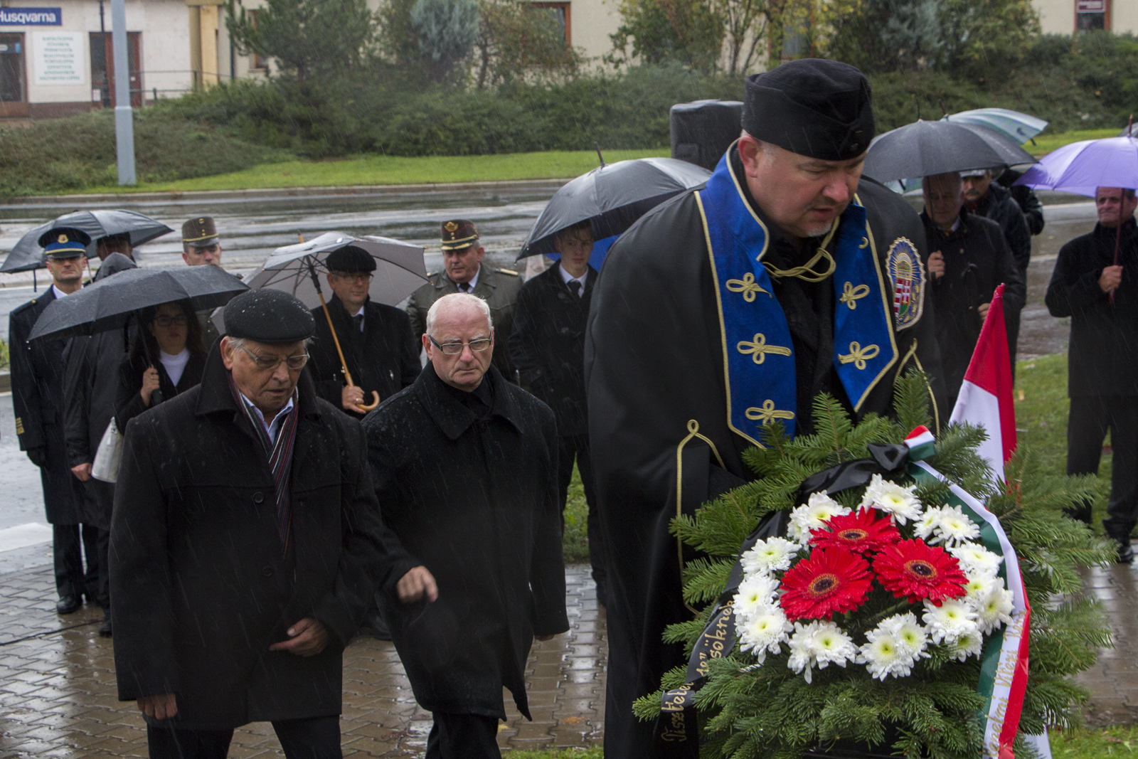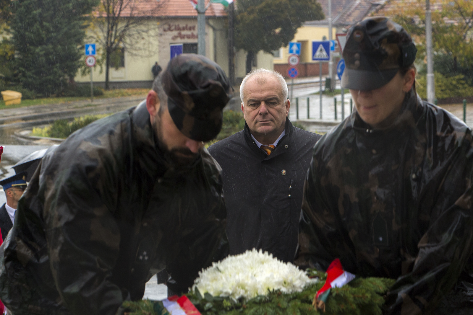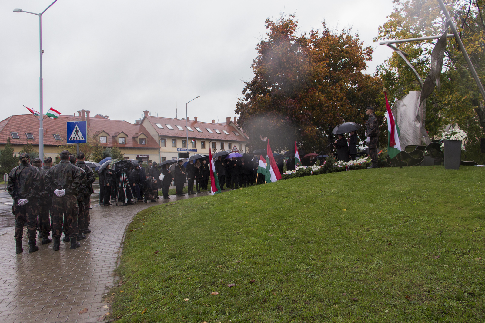 Október 23-án, hétfőn délelőtt az ünnepi megemlékezés és koszorúzás a körforgalomnál található 1956-os emlékműnél folytatódott. A helyszínen beszédet mondott Bencsik János. A Tatai-medence országgyűlési képviselője kiemelte:- a mi közös értékrendünk, a hitünk, a családunk, a nemzetünk, a nyelvünk, s a kultúránk, ezzel szemben pedig a másik oldalon áll egy olyan szövetség, amely mindezeket semmibe veszi, s a megtartóerővel bíró közösségeket leépíti annak érdekében, hogy a pénz és a gazdaság uralmát ki lehessen terjeszteni az egész világra. Most is erről van szó, egyik oldalon áll a gazdaság hatalma, mely azt mondja, hogy az ember van a gazdaságért, míg a nemzetállamok azt mondják, hogy a saját népükért van a gazdaság, és mindennek azért kell történnie, hogy saját kultúránkban, a szabadság örökségét megélve tudjunk élni. E két nagy eszme és életgyakorlat között kell választani: feloldódni a nagyvilág globális nyitott társadalmi rendszerében, vagy megmaradni magyarnak, szabadnak.