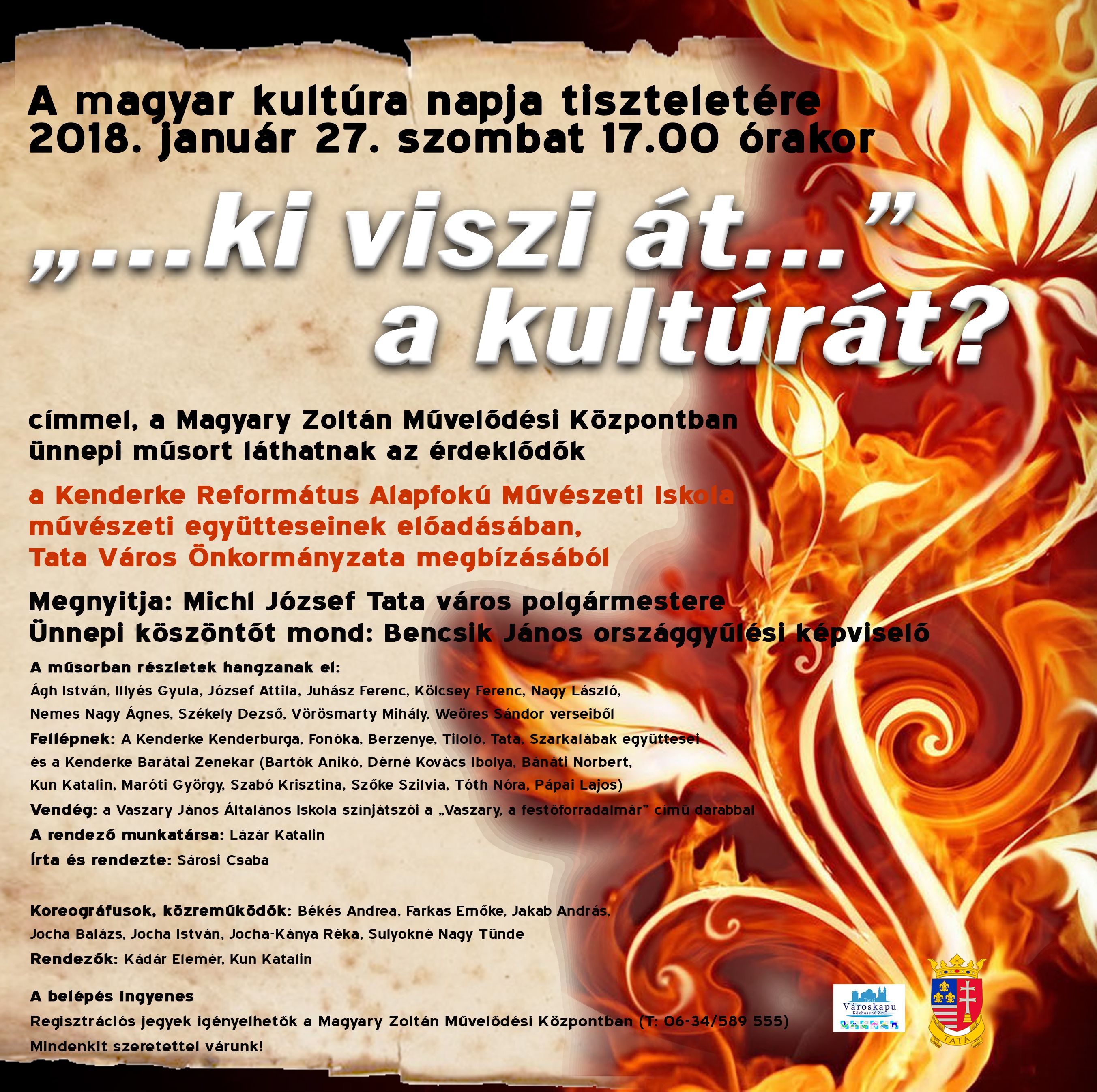 Tata Város Önkormányzata szervezésében január 27-én 17:00 órától „ …ki viszi át … ” a kultúrát? címmel láthatnak ünnepi műsort a magyar kultúra napja alkalmából a Magyary Zoltán Művelődési Központban, a Kenderke Református Alapfokú Művészeti Iskola művészeti együtteseinek előadásában.