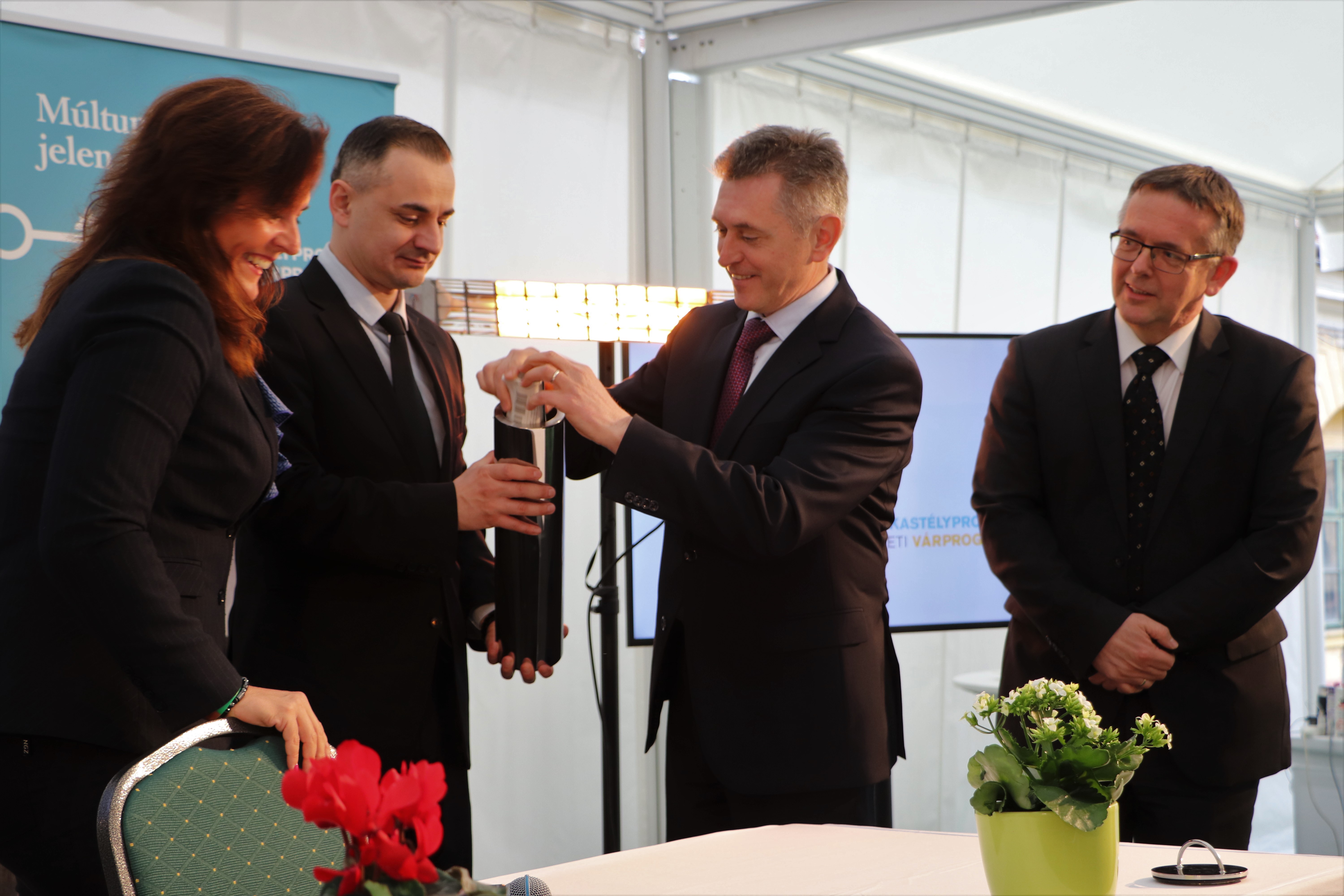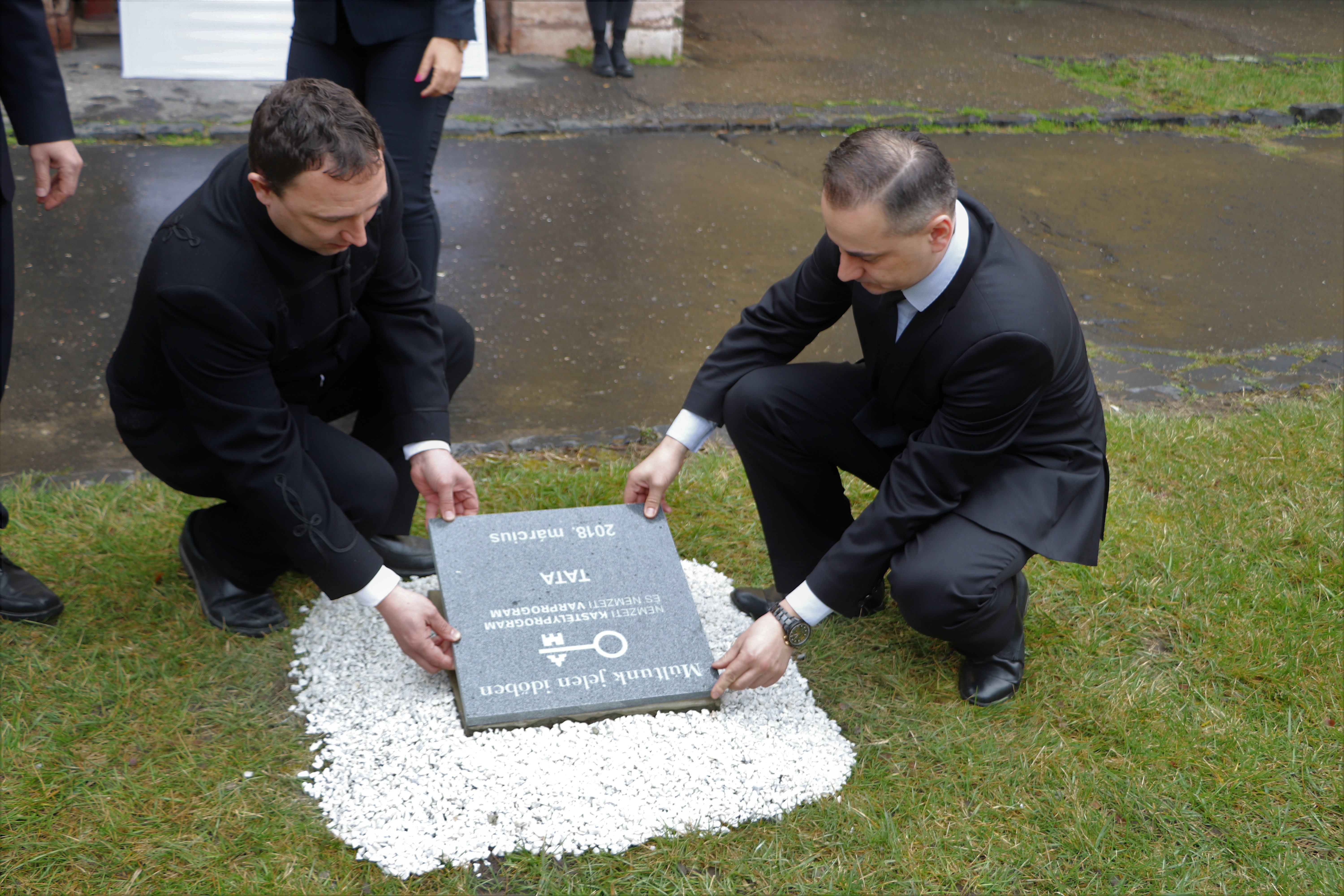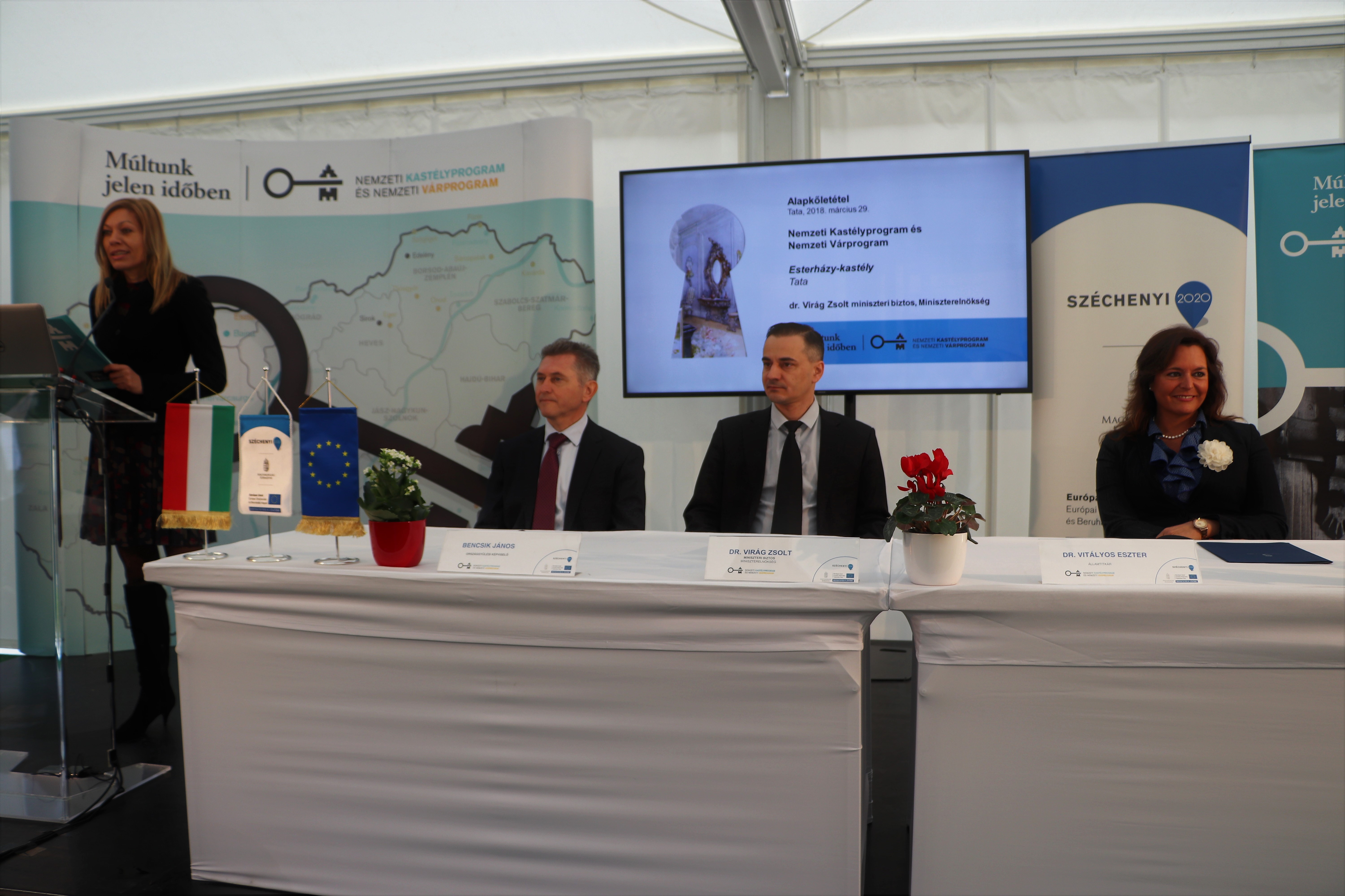 Az eseményen Dr. Virág Zsolt a Nemzeti Kastélyprogram és a Nemzeti Várprogram végrehajtásáért felelős miniszteri biztos mutatta be a tatai Esterházy-kastélyt érintő fejlesztéseket, Bencsik János országgyűlési képviselő áttekintést adott a fejlesztési projekt régióra gyakorolt hatásairól, Dr. Vitályos Eszter európai uniós fejlesztésekért felelős államtitkár pedig tájékoztatott a térség Európai Uniós és hazai források segítségével megvalósult projektjeiről, valamint hazánk már megvalósult sikeres kastélyfejlesztéseiről. Az alapkő ünnepélyes elhelyezése után Michl József polgármester köszöntötte a vendégeket.