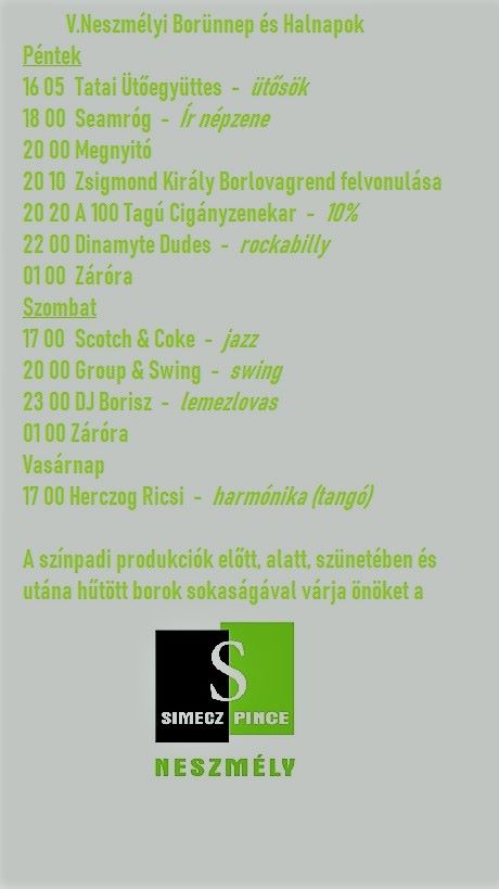 A helyszínen a koncertek mellett 12 neszmélyi borász borait kóstolhatják meg az érdeklődők, akik válogathatnak a különböző ízletes halételek kínálatából is.