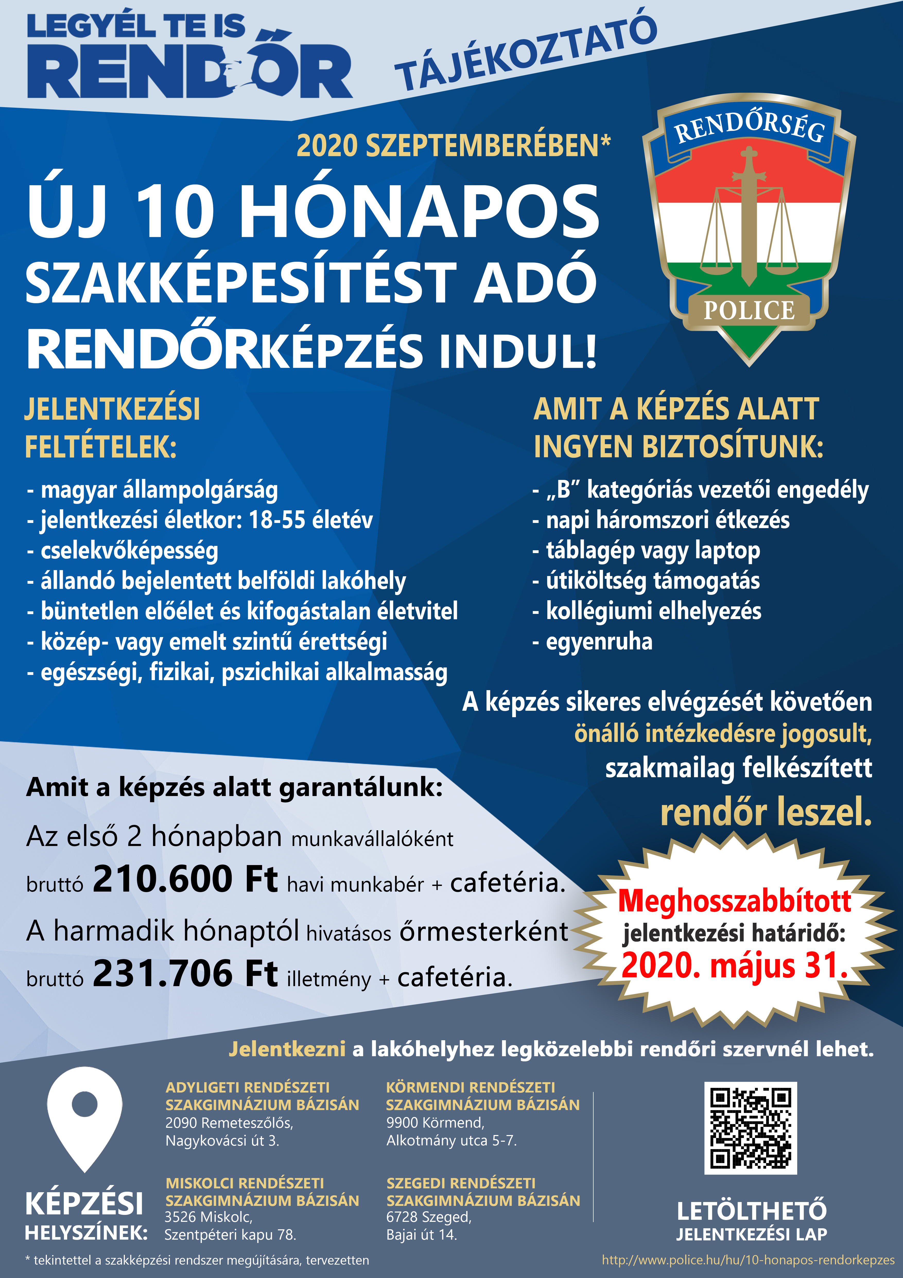 A pandémiás helyzetre figyelemmel a 2020. szeptemberével meghirdetett 10 hónapos képzési idejű, közbiztonsági, illetve határrendészeti járőr szakképesítés megszerzésére irányuló szakmai képzés jelentkezési határideje 2020. május 31. napjáig meghosszabbításra került.