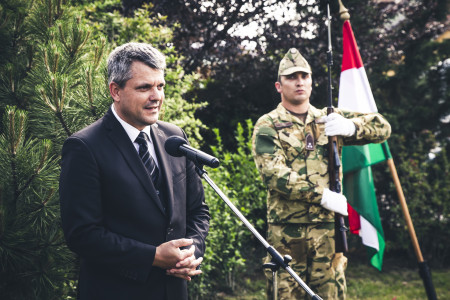 A tatai megemlékezések programja a Nemzeti Összetartozás Emlékművénél folytatódott. Magyarország országgyűlése az Alaptörvényben rögzített felelősségviselés jegyében, a történelmi Magyarország területét szétdaraboló és a magyar nemzet harmadát idegen államok fennhatósága alá szorító, 1920. június 4-én aláírt békediktátum 100. évfordulójára emlékezve, az idei esztendőt a nemzeti összetartozás évének nyilvánította. Tata Város Önkormányzata a Nemzeti összetartozás terén éppen tíz éve felállított emlékoszloppal, melyet Smídt Róbert szőgyéni fafaragó készített, a trianoni békediktátum áldozatai: a jogfosztottá vált, megalázott milliók, a szétszakított családok, és kisebbségi sorsba született utódaik előtt tiszteleg. Az emlékoszlopnál Michl József polgármester mondott beszédet. „Megmaradtunk, megmaradunk, mert összetartozunk” - mondta a városvezető, majd kiemelte: - A mai napon nem csupán szomorkodnunk kell, hanem hálát is kell adnunk. Hálát azért, hogy kibírtuk, hogy túléltük, hogy megmaradtunk, és hogy összetartozunk. De bocsánatot is kell kérnünk azért, mert a 100 év alatt sokszor hosszú évekre felejtettük el őket, a lassan halványuló határon túl élőket, s azért, hogy 2004-ben sok magyar nem szavazta meg azt, hogy ők is magyarok. Hálát adunk, hogy aztán a magyar országgyűlés állampolgárságot adott minden, nem Magyarországon élő magyarnak, akik közül 124-en Tatán tettek esküt… Bocsánatot kérünk, hogy sok határon túl élő írót, költőt, művészt alig ismerünk, de hálát adunk a sok tatai példaképünkért, Dornyay Béláért a piaristáért vagy Magyary Zoltánért, akik munkája nyomán a múzeumunknak 1920 előtti, nagy Magyarországról származó gyűjteménye van. Sokakat sorolhatnék itt természetesen - mondta Michl József - többek között Kálmán Attila képviselőt, tanár urat, aki fáradhatatlanul, a gáncsoskodások ellenére vitte a tatai diákokat a határainkon túlra. Hálát adunk testvérvárosainkért is, Szőgyénért, Szovátáért és Magyarkanizsáért. Most, 100 év elteltével, megkezdve a következő 100 esztendőt, vállaljuk és fogadjuk, hogy a Teremtő akarata szerint mindent megteszünk azért, hogy összetartozzunk. Az előttünk álló 100 évre is bőven marad feladat és munka: tovább halványítani a fizikai határt és erősíteni a lelki, szellemi, szívbéli barátságot, szeretetet, az összetartozást. Most egy olyan 100 év jön, amelyre reményeink szerint utódainknak sokkal könnyebb lesz majd emlékezniük. Isten óvja Magyarországot, Isten éltessen minden magyart! –zárta gondolatait Tata polgármestere.