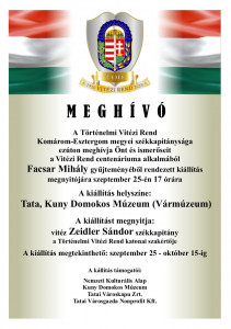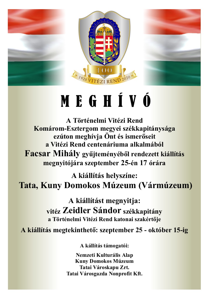 A Történelmi Vitézi Rend Komárom-Esztergom megyei székkapitánysága tisztelettel hívja és várja az érdeklődőket a Vitézi Rend centenáriuma alkalmából, Facsar Mihály gyűjteményéből rendezett kiállítás megnyitójára szeptember 25-én 17:00 órára.