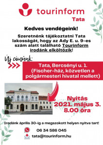 A Tata és Környéke Turisztikai Egyesület tájékoztatja a tataiakat, hogy a Tourinform Iroda hamarosan elköltözik az Ady Endre útról.