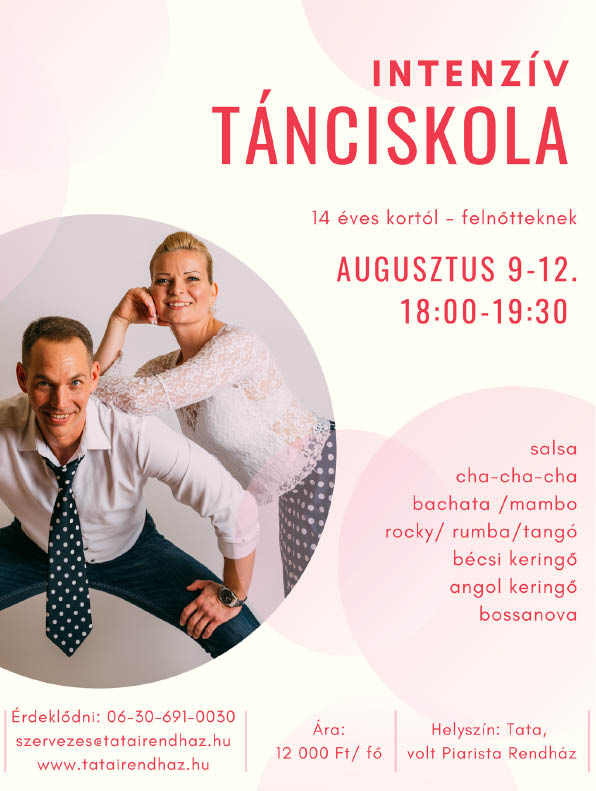 Intenzív tánciskola várja az érdeklődőket idén nyáron 14 éves kortól, a Piarista Rendház épületében. A kurzuson átfogó, alap tánctudást szerezhetnek az érdeklődők egy hét alatt. Megismerkedhetnek a különböző zenei stílusokkal, és megtanulhatják a salsa, cha-cha-cha, bachata, mambo, rocky, angol keringő, bécsi keringő, tangó, rumba bossanova alaplépéseit, alap figuráit.