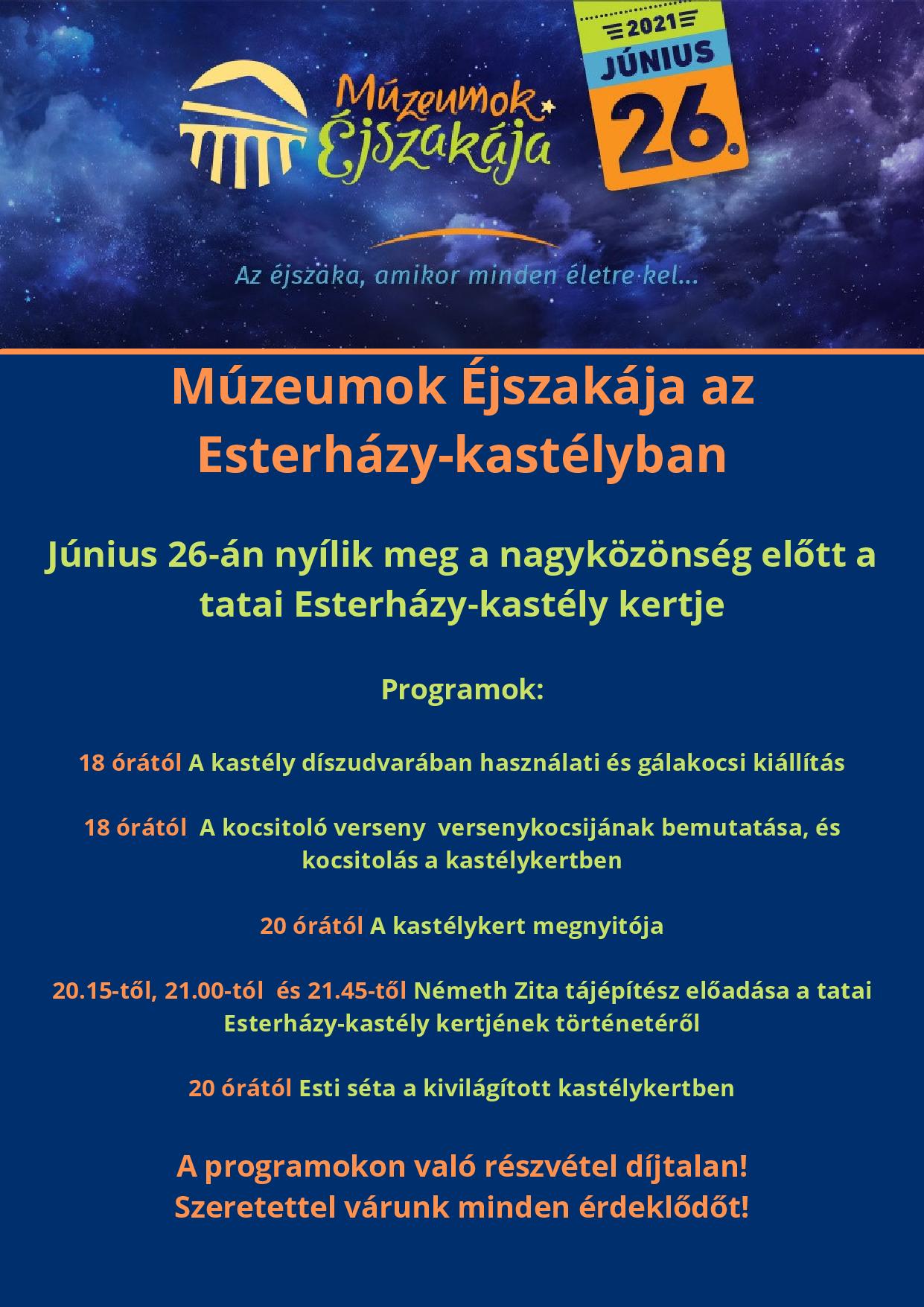 -20:15-től, 21 órától és 21.45-től Németh Zita tájépítész előadása a tatai Esterházy-kastély kertjének történetéről, majd esti séta a kivilágított kastélykertben.