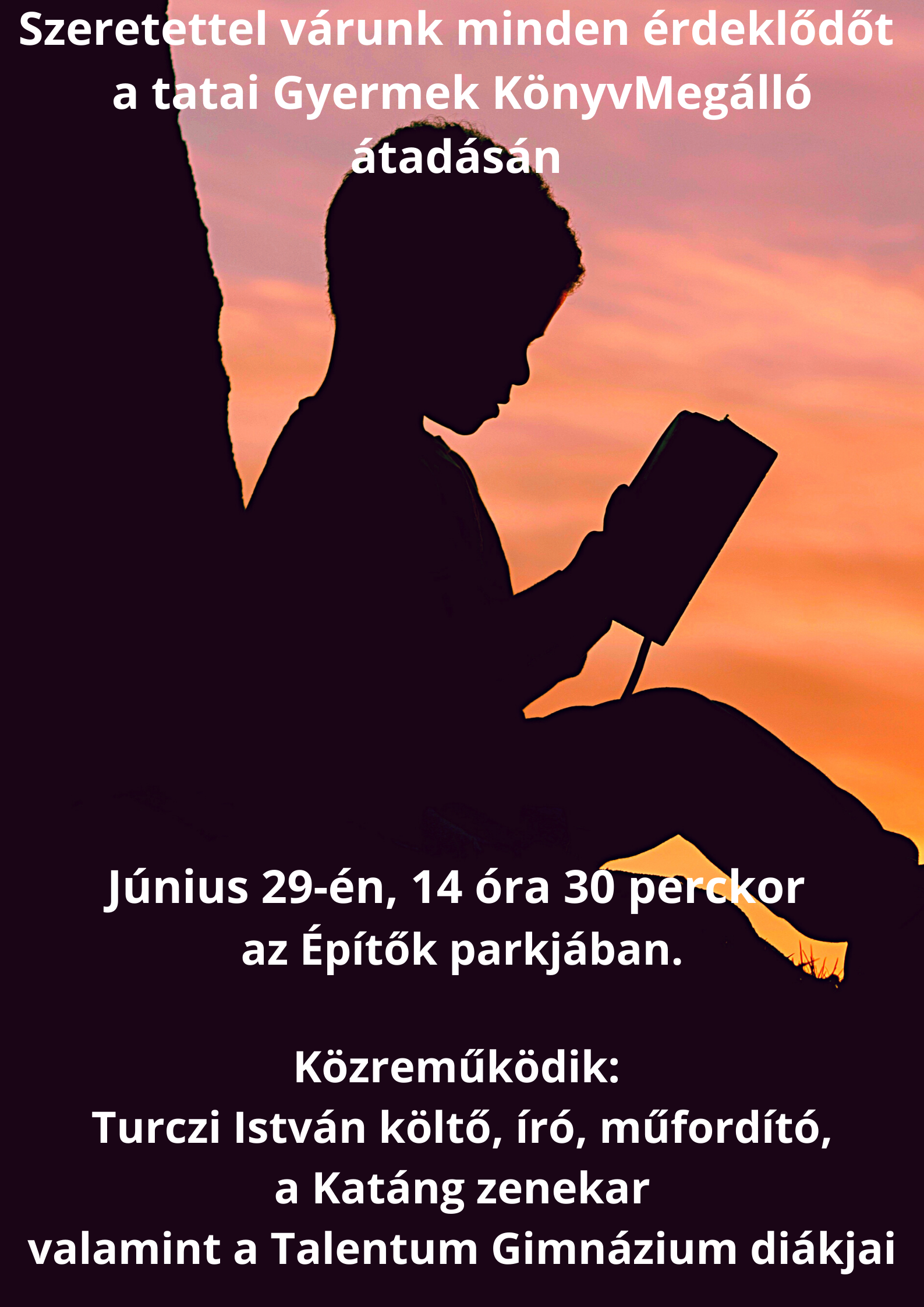 Tata Város Önkormányzata szeretettel hívja és várja az érdeklődőket az UNICEF Gyermekbarát Település díj elismerő címmel elnyert támogatási összegből és az önkormányzat saját ráfordításából megvalósuló Gyermek KönyvMegálló átadására, 2021. június 29-én 14 óra 30 perckor az Építők parkjába.