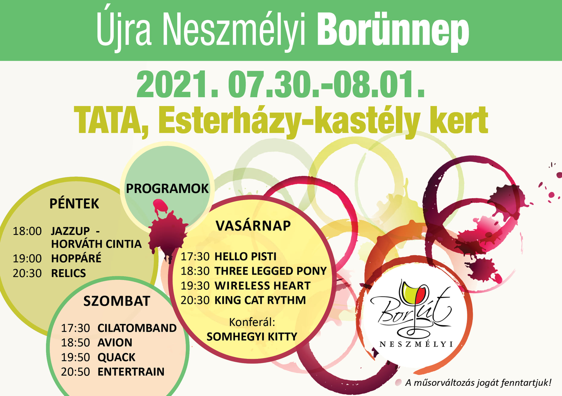 Július 30. és augusztus 1. között hatodik alkalommal szervezik meg a Neszmélyi Borút Egyesület borászai a Neszmélyi Borünnepet Tatán.