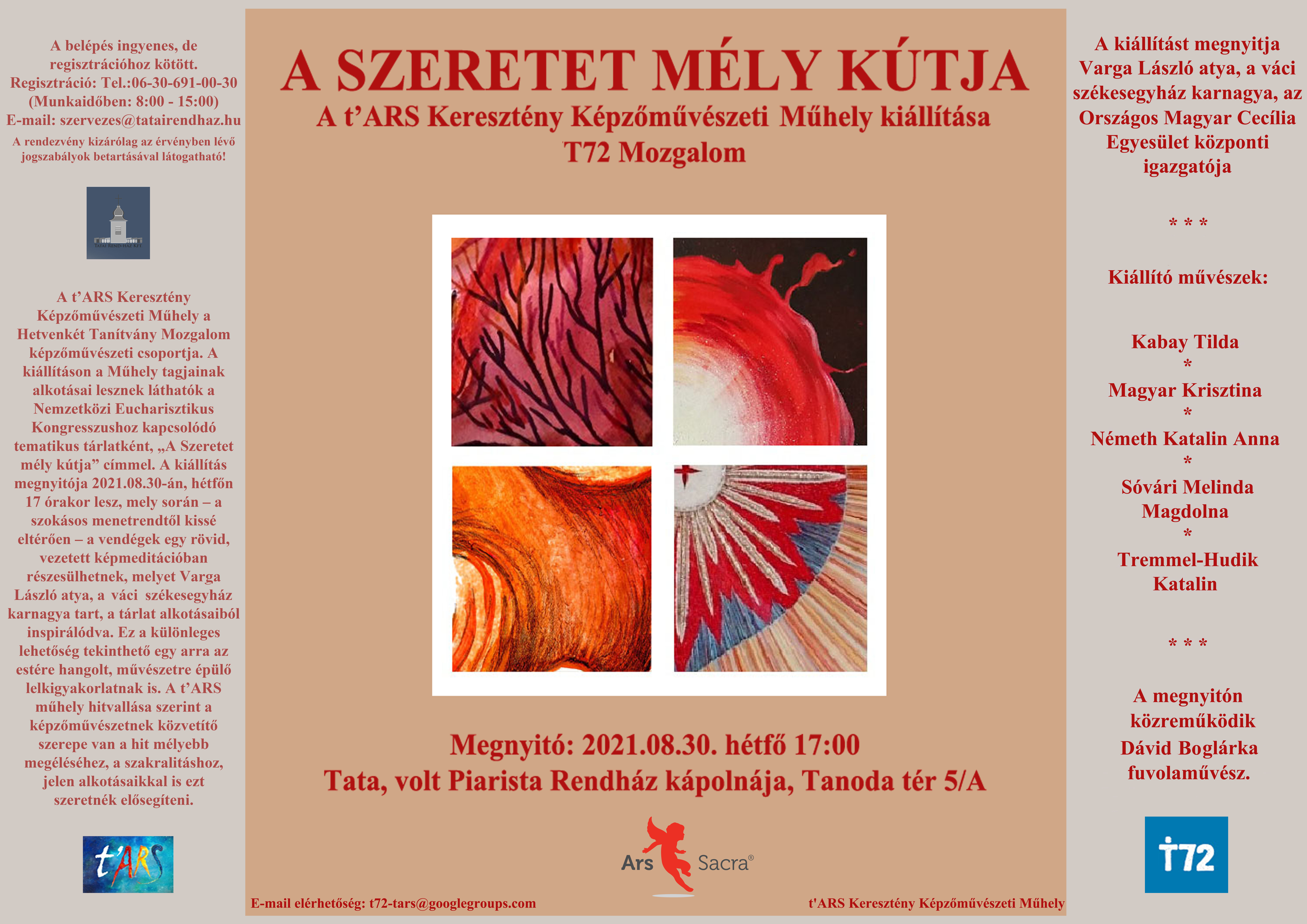 A kiállításon a t’ARS Keresztény Képzőművészeti Műhely tagjainak alkotásai láthatóak majd. Az alkotóközösség hitvallása szerint a képzőművészetnek közvetítő szerepe van a hit mélyebb megéléséhez, a szakralitáshoz, alkotásaikkal is ezt szeretnék elősegíteni.