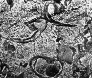 Kipreparálódott Megalodus-teknők a barlang fő folyosójának Jóséjén (Vajha Gy. felvétele)