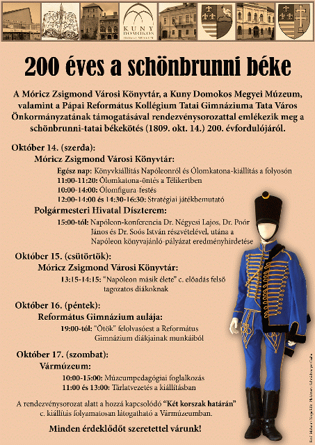 A Móricz Zsigmond Városi Könyvtár, a Kuny Domokos Megyei Múzeum, valamint a Pápai Református Kollégium Tatai Gimnáziuma Tata Város Önkormányzatának támogatásával rendezvénysorozattal emlékezik meg a schönbrunni-tatai békekötés (1809. október 14.) 200 éves éfordulójáról. A mellékletben a kapcsolódó programokról olvashatnak.
