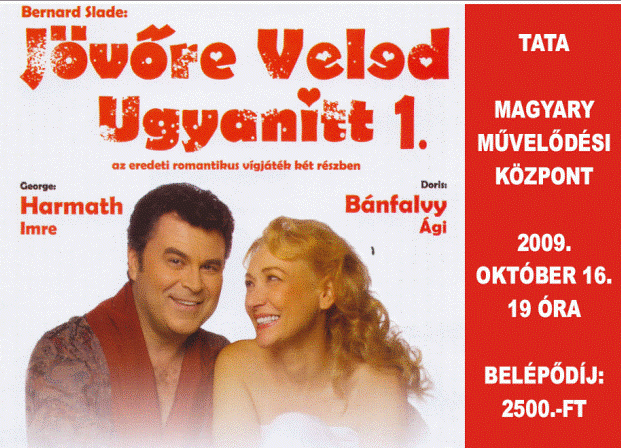 Az immáron modern színházi klasszikussá vált amerikai vígjáték, Bernard Slade Jövőre veled, ugyanitt! című darabját láthatják a tatai Magyary Zoltán Művelődési Központban október 16-án este hét órától. A kétszemélyes szerelmi történet szereplői, Bánfalvy Ági és Harmath Imre megjelenítik a több évtizeden át tartó kapcsolat fázisait, szinte megszelídítve a titkos viszonyt. A szerelem mibenlétéről és ellentmondásairól könnyed formában színre vitt darab rengeteg helyzetkomikumra kínál lehetőséget, s két ember életének állomásait is megjeleníti e különös szerelmi történet tükrében.