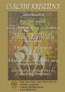 Családi Krisztina alkotásaiból nyílik kiállítás október 16-án 18 órakor a Hotel Kristály aulájában. A kiállítást Szentessy Éva nyitja meg, a képek november 20-ig tekinthetők meg. Minden érdeklődőt szeretettel várnak!