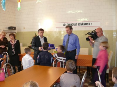 Az elmúlt héten a Kőkúti Iskolában átadott új ebédlő után most a Vaszary János Általános Iskola étkezője is megújult. A diákok ünnepi műsor keretében vették át a székeket és asztalokat, melyeket az önkormányzat vezetői adtak át. Tarr József igazgató elmondta, hogy a Gyermekbarát város program keretében sikerült a bútorzatot megújítani, ennek költsége körülbelül 1,6 millió forint volt. A korszerű és kényelmes bútorok a helyiség hangulatát is teljesen megváltoztatták, a szép környezetre a tanulók is jobban vigyáznak. A közelgő karácsony alkalmából Michl József polgármester új játékokkal is megajándékozta az első osztályos kisdiákokat.