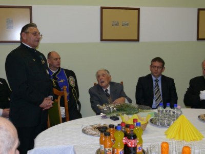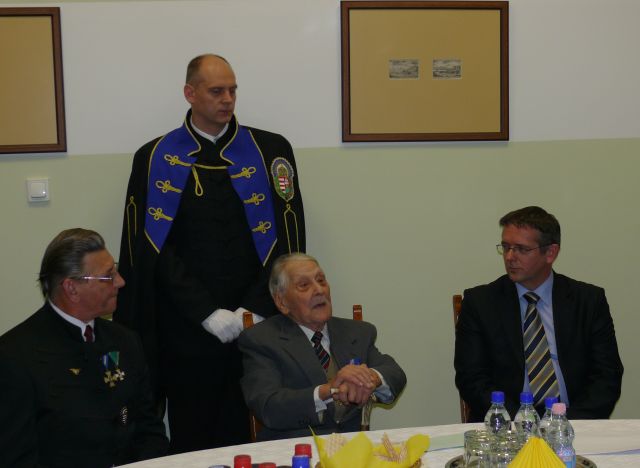 Kovács Ernő nyugalmazott tanár 1910. január 7-én született a Pannonhalmához közeli Pázmándfaluban, kilenc testvérével nevelkedett a családban. A Don-kanyart is megjárt nevelő három évet töltött hadifogságban, de onnan is hazavezérelte jósorsa. 1954-től tanított a tatai Vaszary János Általános Iskolában, s gyermekei közül többen is e nemes pályát választották. Az ünnepségen elmesélte az agg vitéz, hogy volt kitől örökölnie az erőt és a kitartást az élet viszontagságai közepette. Édesapja Pázmándfaluban gazdálkodott, s kilenc gyermeket nevelt fel feleségével, noha bal kezét elveszítette egy balesetben. Abban az időben húsvétkor lövöldöztek elöltöltős, öreg mordályokkal, s az egyik eldugult. A katonaviselt Kovácsot kérték meg, hogy javítsa meg, s a fegyver elsült a kezében. Félkézzel is sokat dolgozott, s 92 esztendős koráig élt a családapa! Egyik fia, az ünnepelt fivére az első háború hősi halottja, de Ernő bácsi egyetlen ifjabb testvére, öccse is 96 évet élt.