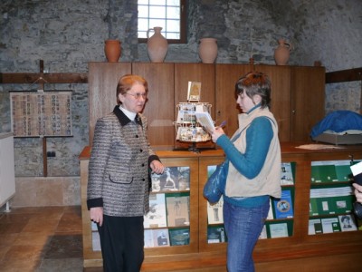 A tatai várba látogatók mostantól egy tágas aulába, fogadótérbe léphetnek be. Az ajtóval szemben árusítópultot helyeztek el, ahol felsorakoztatták a múzeumi kiadványokat, és a gyűjteményhez kapcsolódó ajándéktárgyakat, valamint egy kényelmes ruhatárat alakítottak ki. Érdekesség még az az érmekészítő berendezés, mely az Esterházy-címert, egy lovagtermi kályhacsempe-másolatot és a tatai várat ábrázoló motívumokat varázsolja a bedobott pénzérmére. A következő teremben pedig míves székek és asztalok marasztalják a turistákat még egy kis csevelyre vagy kávéra. Ez a helyiség kisebb konferenciák, előadások, múzeumpedagógiai foglalkozások rendezésére is alkalmas.