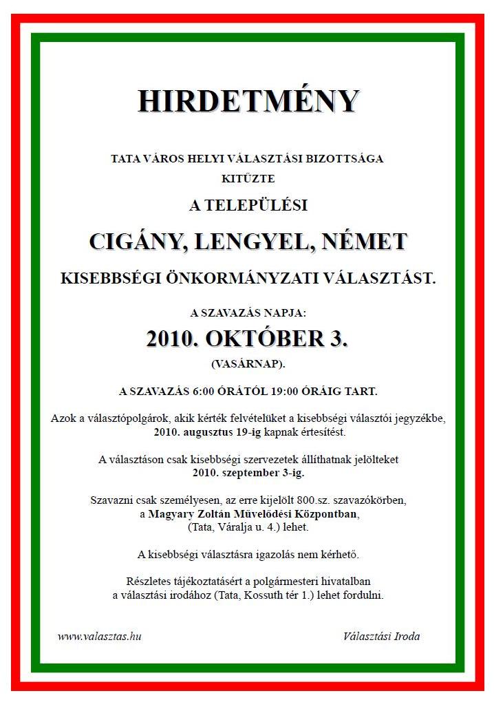 Tata város Helyi Választási Bizottsága kitűzte a települési cigány, lengyel, német kisebbségi önkormányzati választást.