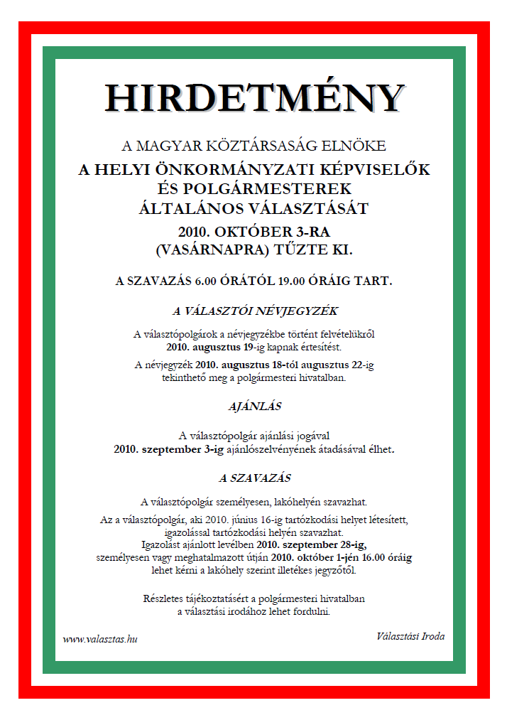 A Magyar Köztársaság elnöke a helyi önkormányzati képviselők és polgármesterek általános választását 2010. október 3-ra (vasárnapra) tűzte ki.