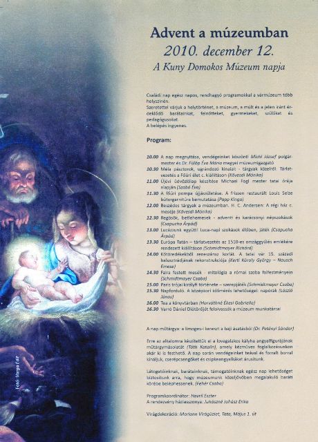 11.00 Újévi üdvözlőlap készítése Michael Fogl mester tatai órája alapján (Szabó Éva) 11.30 A főúri pompa újjászületése. A frissen restaurált Louis Seize bútorgarnitúra bemutatása (Papp Kinga)