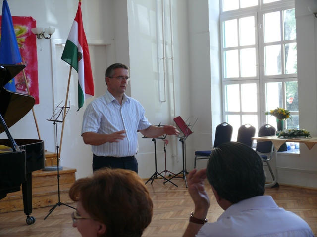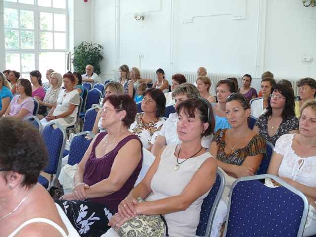A szakmai nap a Menner Bernát Zeneiskola koncerttermében kezdődött, ahol az éppen itt gyakorló zenei mesterkurzus növendékei és tanárai rövid műsorral kedveskedtek a jelenlevőknek. Az ország számos pontjáról érkeztek óvónők, s a tataiak is szép számmal. Michl József országgyűlési képviselő, Tata polgármestere köszöntötte, őt Robozné Schőnfeld Zsuzsanna alpolgármester követte, aki a Tata lépten-nyomon című könyvet mutatta be.